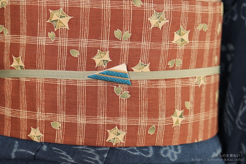 底辺が5cmの三角形なので、小さな富士山を目立たせるために三分紐の色を帯の模様と同色にしました。