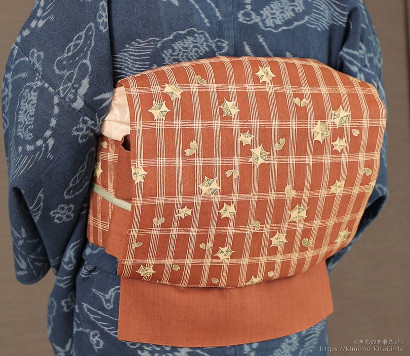 - 明るい藍染の着物を落ち着かせるのには地味めな色がいい