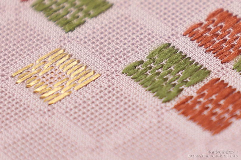 絽刺しは絽の生地を使います。布のたてのラインに沿って絹の強撚糸を巻くように刺すのが特徴です。