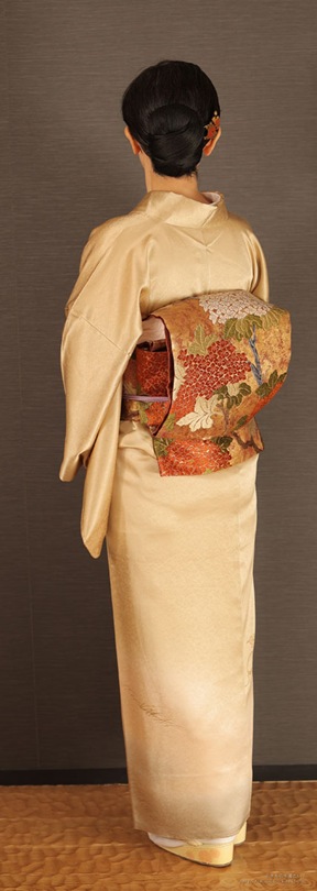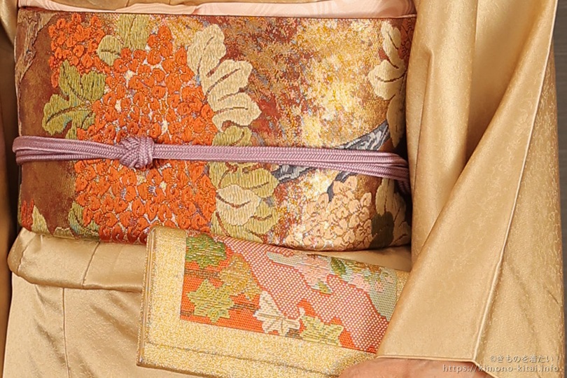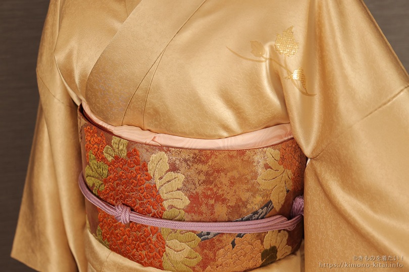 この付下げはデザインがおとなしく柄も小さいので、帯は大きな花の意匠の唐織りの袋帯を選びました。