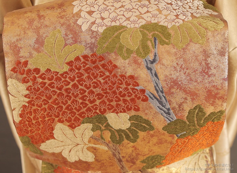 大輪の花は紫陽花ですが、葉は菊、そして茎は枝分かれするのが特徴である牡丹の茎です。想像上の花、幻の花ということで、春でも秋でも季節は問わず着用できます。